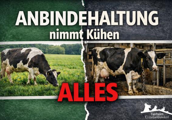 Die Kühe sind über Monate oder sogar ihr ganzes Leben lang an einem festen Platz angebunden. Sie können sich kaum bewegen, nicht frei laufen, nicht selbst entscheiden, wann sie sich hinlegen oder aufstehen. Sozialkontakte zu anderen Kühen sind stark eingeschränkt.