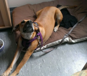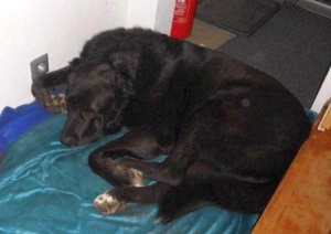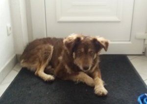 Hier ein paar Bilder von Diosa. Wir machen millimeterweise Fortschritte :-). Die Garderobe ist ihr Platz, sieht einfach nur unbequem aus, aber sie ist noch nicht ins Wohnzimmer zu bekommen. Ab und an mal nachts geht sie dann doch, denn die verteilten Leckerlis sind gefressen/weg und die Fernbedienungen und das Kratzbrett der Katze liegen in ihrer Ecke. Maximal zum Fressen geht sie in den Flur. Das mit dem Lösen klappt jetzt auch :-)
