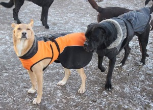 Und dann immer das rum Gelatsche in Wald und Feld. Jeden Tag bei jeden Wetter muss ich raus. Und dann ziehen sie mir manchmal so ein komisches orangenes Mäntelchen an. Damit sehe ich aus wie ein Affe. Die Mädels in der Hundepension schmunzeln schon über mich. Aber knutschen kann ich sie trotzdem noch. Schlafen muss ich auf der Couch im geheizten Wohnzimmer. Alle andern schlafen im ersten Stockwerk in der Kälte. Da führt eine steile Treppe rauf. Die bin ich nicht gut hoch gekommen und einmal fast runtergefallen. Da gehe ich nicht mehr hoch. Sollen die mich doch hoch schleppen, wenn die wollen, dass ich oben bin.