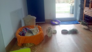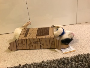 Hier ist eigentlich immer etwas los. Wenn ich nicht gerade Füße zum Spielen habe, finde ich hier immer etwas, das ich durch das Wohnzimmer jagen und unter der Coach versteckeln kann: Bleistifte, Würfel, Flummis, Tischtennisbälle oder Haargummis. Die Hasen sehe ich bisher nur vom Fenster aus, raus darf ich noch nicht, erst im Frühjahr. Aber es macht mir bestimmt viel Spaß, dann mit den Kindern (und Hasen) im Garten zu toben.