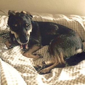 Am Anfang wollte er auch immer in Frauchens Bett. Er hat auch heimlich da mal markiert. Damit Herrchen gleich weiß, wem was ist. Aber das durfte er nicht und wurde immer wieder auf seinen Platz geschickt. Und wenn es auf dem Platz getrockneten Panzen gibt, dann geht man da ja gerne hin. Also mittlerweile schläft er gerne auf seinem Platz. Weckt nachts niemanden mehr, sondern lässt sich morgens wecken und dann geht es mit Frauchen ins Büro. Ich glaube, sein neues Leben gefällt ihm ganz gut.
