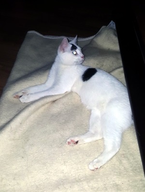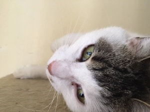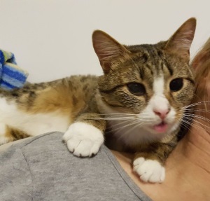 Zu mir und meiner Tochter und auch zu anderen Anwesenden ist Alexia sehr aufgeschlossen und zutraulich. Wenn sie sich zurückzieht, geht sie unter das Bett in "ihrem" Zimmer. Wenn ich den Raum betrete, mich setze und sie beim Namen rufe, kommt sie sofort an und schmust mit mir. Natürlich macht sie das auch, wenn sie durch die Wohnung streift oder sie sich zu mir setzt. Sie ist wirklich eine tolle Katze. Auch die Behandlung von ihrem Kinn verläuft unproblematisch. Sie läßt sich alles ganz ruhig gefallen. Und sie liebt es zu fressen. Sie ist auch schon wiederholt an das Fresschen von meiner Peppina gegangen. Es hat ihr scheinbar geschmeckt.