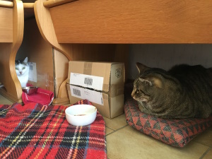 Dann der "Umzug" unter die große Sitzfläche der Bank auf ein weiches Kisssen. Zum Glück hatte sie immer Hunger!