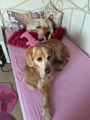 Sie orientiert sich tatsächlich an unserem Retriever-Opi Sammie, der sie auch schon mal verteidigt und beschützt gegenüber fremden Hunden.