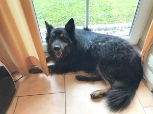 Beim Fell sind wir auch schon weitergekommen: wir haben schon jede Menge ausgekämmt und arbeiten uns von Tag zu Tag vor. Übrigens: er schmeißt sich immer öfter auf den Rücken und läßt sich inzwischen von uns an Bauch und Brust ohne Probleme kraulen ...