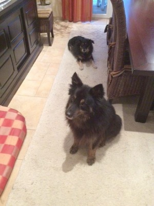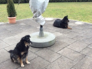 Mit dem kompletten Rudel kam er auch schon 2 - 3 Mal in Kontakt bei uns im Garten. Es gab bis jetzt keinerlei Probleme mit Bruno oder den anderen Hunden. Mit unserer Laika versteht er sich prima. Sie sind praktisch den ganzen Tag zusammen. Laika kann sich gut gegen Buddy durchsetzen und faucht ihn auch mal richtig an, wenn es ihr zu bunt wird. Futter geben wir ihnen getrennt, damit es keinen Stress gibt.