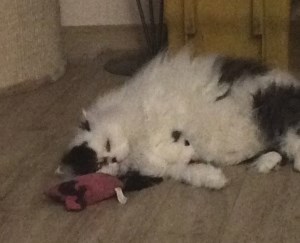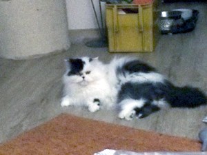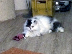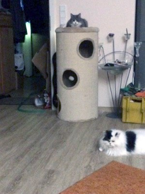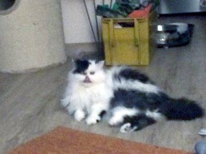 wie gewünscht sende ich Ihnen ein paar erste Bilder von Danny. Er hat sich schon gut eingelebt und kann mit Katze Amy und Hund Cara schon zusammen im Wohnzimmer liegen. Das Bett im Schlafzimmer hat er sich als Tagesruheplatz auserkoren. Fressen klappt wunderbar und auch die Augensalbe lässt er sich nun nach den ersten 3 Tagen verabreichen. Beim Kämmen wird geschnurrt und gesabbert, was das Zeug hält. Und seit heute morgen fordert er mit heller Stimme sein Recht auf Futter und Streicheleinheiten ein.