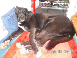 Hier ein paar Bilder von Diosa. Wir machen millimeterweise Fortschritte :-). Die Garderobe ist ihr Platz, sieht einfach nur unbequem aus, aber sie ist noch nicht ins Wohnzimmer zu bekommen. Ab und an mal nachts geht sie dann doch, denn die verteilten Leckerlis sind gefressen/weg und die Fernbedienungen und das Kratzbrett der Katze liegen in ihrer Ecke. Maximal zum Fressen geht sie in den Flur. Das mit dem Lösen klappt jetzt auch :-)