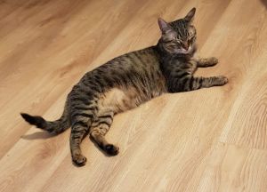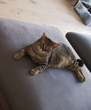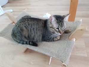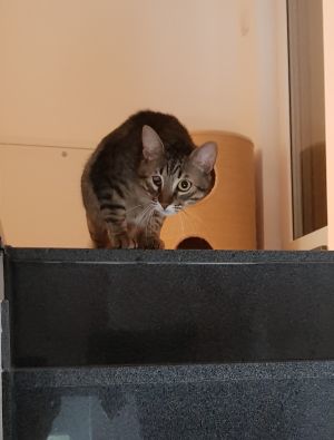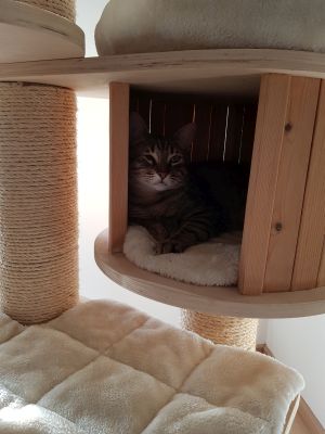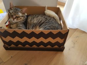 Tagsüber ist er im ganzen Haus unterwegs, sucht aber den Kontakt zu uns. Oft sucht er sich dann in unserer Nähe einen Platz, an dem er es sich gemütlich machen kann. U.a. hat er auch eine Pappkiste für sich entdeckt, in die wir ihm noch ein Kissen gelegt haben.