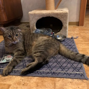 Sie sucht extrem meine Nähe und liegt aktuell hinter dem Stuhl auf dem Teppichboden.