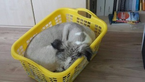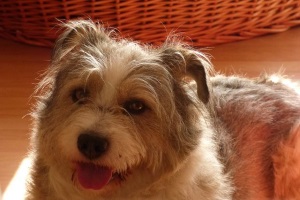 Am Anfang wollte er auch immer in Frauchens Bett. Er hat auch heimlich da mal markiert. Damit Herrchen gleich weiß, wem was ist. Aber das durfte er nicht und wurde immer wieder auf seinen Platz geschickt. Und wenn es auf dem Platz getrockneten Panzen gibt, dann geht man da ja gerne hin. Also mittlerweile schläft er gerne auf seinem Platz. Weckt nachts niemanden mehr, sondern lässt sich morgens wecken und dann geht es mit Frauchen ins Büro. Ich glaube, sein neues Leben gefällt ihm ganz gut.
