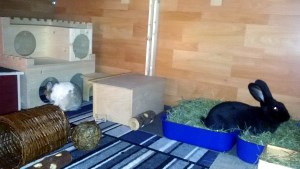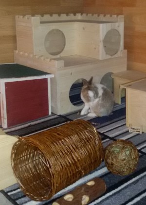 Blacky ist total unbedarft, zutraulich und macht Bocksprünge, schlägt Haken und rennt was das Zeug hält. Bonnie ist eher zurückhaltend und orientiert sich an Blacky. Sie kommt noch nicht aus dem Gehege raus. Der Appetit ist sehr groß bei beiden und alles wird bis auf den letzten Krümel gegessen. Als Wilkommensgeschenk haben wir eine Doppelstockvilla gekauft. Wir haben das Gefühl, beide sind angekommen und glücklich über ihr neues Zuhause.