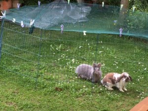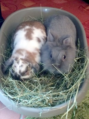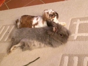 Ich war immer noch untröstlich, weil mein geliebter Moppel verstorben ist und ich ganz alleine war, da bekomme ich Teile meines Gebietes (für das ich mich zugegebenermaßen nie sonderlich interessiert habe) abgenommen und ein fremder Kerl ist da. Sieht nett aus, dachte ich. Ich werde mich ihm als alteingesessenes Weibchen mal am Zaun vorstellen - komisch, dass der gar keine Angst vor mir hat. Hmm, schlecken kann man ihn auch und am Zaun zusammen liegen ist prima - da bin ich nicht mehr alleine. Futter schmeckt jetzt wieder viel besser. Und dann kam der Tag, an dem wir zusammengesetzt wurden- hier war ich noch nie! Und dann der fremde Hasenmann! Ich habe solche Angst – nur verstecken, wegrennen – HILFE …. Tage später - naja vielleicht mal vorsichtig annähern, was kann passieren? Er putzt sich auch, dann können wir gemeinsam putzen…. Lässt sich schlecken… man kann mit ihm kuscheln…. Sehr netter Kerl…. MOMENT MAL, war ICH früher nicht die Chefin und die Nummer 1? Das muss ich ihm unbedingt mitteilen!!! ... Nach Wochen sind wir umgezogen ins Wohnzimmer - ich glaube, ich war schon mal hier, kann mich aber nicht mehr so gut erinnern. Auf jeden Fall ist es hier sehr schön, mit Dex an meiner Seite.