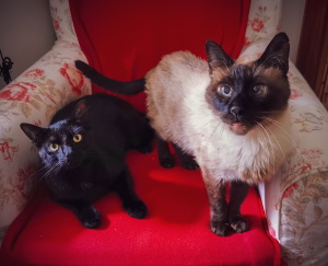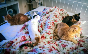 Opa Motzi - der oft eine lustige Mischung aus Schaf und Hund zu sein scheint - ist hier sehr beliebt und wird dauernd von jemandem angeschmust. Hier sieht man ihn zusammen mit Leo (rot), Emil (schwarz, auf dem Sessel) und seinem Kumpel Bonito.