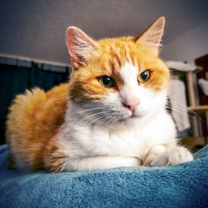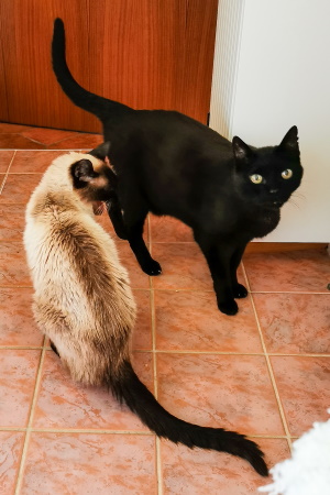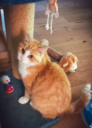 Samson geht es zum Glück seit dem anfänglichen Rückfall prima. Er ist auf charmante Art sehr eigenwillig und bräuchte die anderen wohl nicht zu seinem Glück, auch wenn er sich mal gnädig mit dazu legt (hier mit Ella, Leo und Chili)... Er spielt sehr gern und liefert sich mit "Erzfeind" Chili hin und wieder ein Gesangsduell - von den beiden will dann immer erstmal keiner der Klügere sein und nachgeben...