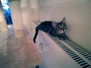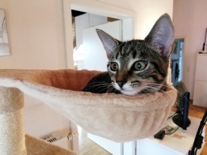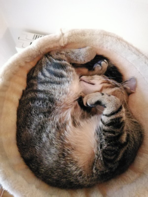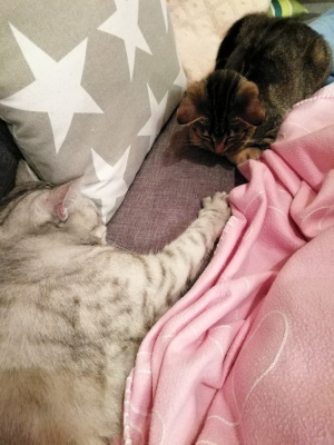 Bzw wollte Karli das. Und inzwischen sind die zwei toll aneinander gewöhnt und tollen durch die Wohnung. Sie liegen noch nicht direkt nebeneinander...