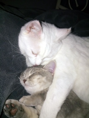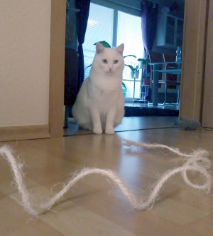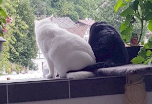 Als wir vor ungefähr einem halben Jahr umgezogen sind, hatte meine Familie eine Überraschung für uns Katzen: sie haben ein Zimmer eingerichtet, wo nur unsere Möbel drin stehen und ganz viel Platz zum Spielen ist. Kira liegt gern auf dem weichen Fensterbrett und beobachtet die Vögel. Ich spiele ganz gern mal in unserem Zimmer, aber am liebsten halte ich mich in der Nähe meiner Familie auf.