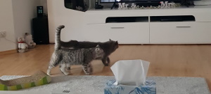 Nach einer Woche, Sonntags um genau zu sein, kamen beide aus Ihrem Versteck raus und trauten sich dann auch in unser Wohnzimmer. Wir wurden aber aus sicherer Entfernung begutachtet, man weiß ja nie. Von Tag zu Tag trauten sich die beiden mehr zu.