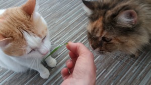Sie braucht regelmäßig Medikationen, leider hat sie dadurch auch einige Backenzähne verloren, aufgrund dessen kann sie u.a. kein Gras mehr abscheren, das sie aber regelmäßig braucht. Deshalb muss jeder Grashalm einzeln gefüttert werden (s. Fotos) + leider ist auch nicht jedes Gras das richtige!