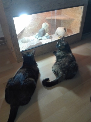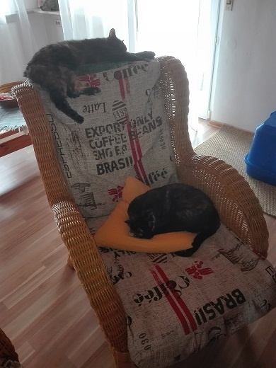 anbei ein paar Bilder von Carey und Pinocheta (bei uns Poison und Ivy), die jetzt seit 18 Monaten bei uns leben und die sanftmütigsten Katzen sind, die wir je hatten.