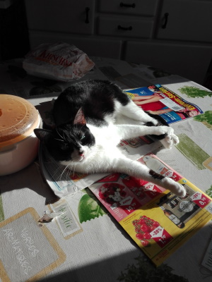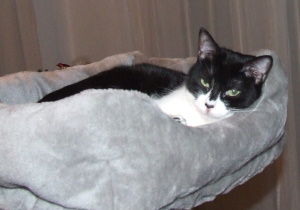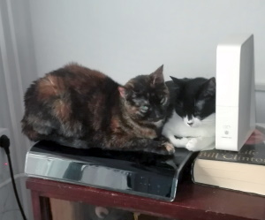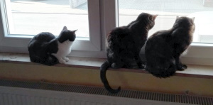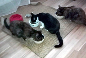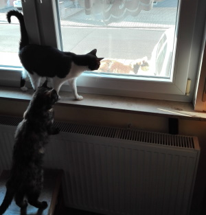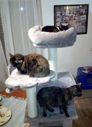 Die ersten paar Tage mit Trixie waren ein bisschen stressig, aber das hatten wir erwartet. Es gab (hauptsächlich von Poison) vor lauter Angst erst mal viel Fauchen und Grollen, aber nie Aggressivität. Trixie verbrachte die ersten paar Tage hauptsächlich auf unserem Wohnzimmerschrank. Mittlerweile kommen alle drei prima miteinander aus. Erst ignorierte man sich, aber mittlerweile wird auch gespielt und es