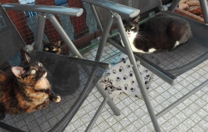 mit ihren beiden Adoptiv-Schwestern Poison und Ivy prima aus. Trixie ist sehr neugierig und erkundet gerne das Haus; seitdem wir die Sommersaison auf dem katzensicheren Balkon eröffnet haben, nutzt sie diesen ausgiebig