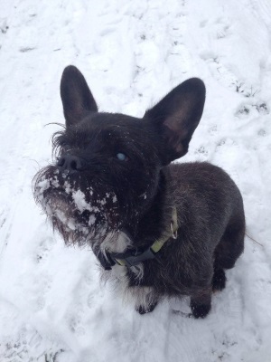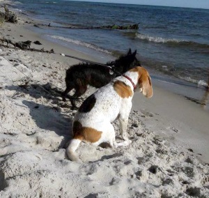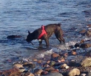 Kana hat sich von Anfang an sehr gut bei uns eingewöhnt, auch den Umzug im Herbst 2013 an die Ostseeküste hat sie sehr gut überstanden. Sie ist einfach super unkompliziert, kommt gerne überall mit hin und ist überall (insbesondere bei unseren Eltern und deren Hunden) sehr gern gesehener Besucher. Lange Spaziergänge mit dem Pony und Ausflüge an den Strand sind ihr Wochenhighlight, bei dem sie sich voll austobt. Sie liebt es mit dem Ball zu spielen, apportiert den auch fleißig und hat so auch ihre Lust am Schwimmen entdeckt. Beim Spaziergang ist sie voller Elan und freut sich, wenn sie ihre Hundefreunde trifft, in der Wohnung ist sie absolut friedlich und pflegeleicht (sie kaut nichts an, klaut keine Lebensmittel,...), wobei sie am liebsten zwischen uns auf dem Sofa kuschelt. Wir teilen uns unsere Stundenpläne (Uni) immer so ein, dass Kana möglichst wenig alleine zu Hause sein muss, (max. 3 Stunden) damit kommt sie gut klar und verbringt diese Zeit meistens schlafend in ihrem Korb. Ihr blindes Auge macht ihr keine Schwierigkeiten (kein tränendes Auge, keine Entzündungen o.Ä.), wir lassen es allerdings regelmäßig vom Tierarzt kontrollieren, da es mit den Jahren doch sehr geschrumpft ist.