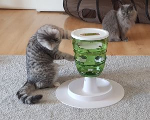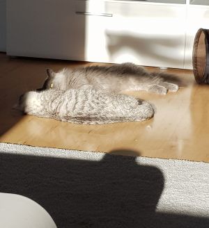 Wenn unser Personal von der Arbeit nach Hause kommt, dann begrüßen wir sie maunzend, natürlich, wir haben ja auch schon sooooo lange nichts mehr zu fressen bekommen. Hunger!!!