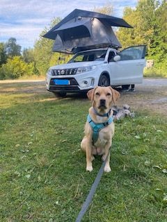 Im August war sie das erste Mal mit uns in Schweden, zwei Wochen mit Dachzelt, unterwegs. Da wurde sie zum wirklichen Camper. Sie genoss es sehr, morgens in der Sonne zu liegen und zu entspannen, und nachmittags neue Gegenden zu erkunden. Dort hat sie auch gelernt, Blaubeeren direkt vom Busch zu stibitzen. Auf einer unserer Trailrunning Strecken war sie das erste Mal richtig schwimmen mit uns. So eine schöne Abkühlung an einem relativ warmen Tag, für Skandinavien. Selbst als wir nachts Besuch von Füchsen am Dachzelt hatten, hat sie mit aller Ruhe beobachtet und schlief direkt wieder ein. Hat sich wohl doch nicht gelohnt, dafür wach zu werden. Sie ist glücklich, wenn sie einfach nur dabei sein kann. Der kleine Sonnenhund. Ein paar Bilder davon findet ihr ebenfalls im Anhang.