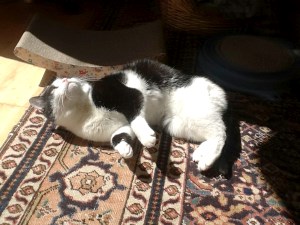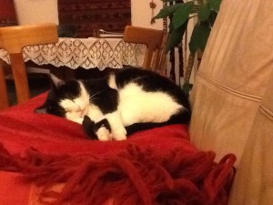 Dann schlafen wir zusammen. Das ist sehr gemütlich. Aber wenn morgens nach dem Frühstück der Betrieb im Häuschen losgeht, bin ich in meinem Versteck. Es gibt Leute, deren Stimme kenne ich. Es sind sicher liebe Leute. Sie hocken sich dann vor mein Versteck und begrüßen mich freundlich. Ich schnurre dann und schau ein bisschen heraus. Aber ich bleibe in meinen Kissen. Vielleicht schaffe ich es bald, mal kurz zum Schmusen zu ihnen zu gehen. Mal sehen!?