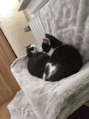 Nach einer guten Woche haben sich die beiden sehr gut bei uns eingewöhnt. Es wird viel gekuschelt und gespielt. Selbst Quentin, der anfangs der etwas zurückhaltende war, lässt sich mittlerweile gerne streicheln.