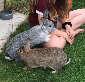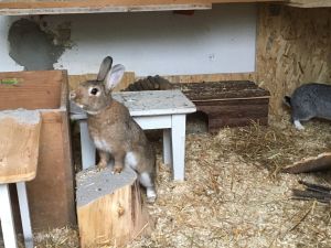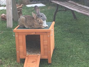 Sie dürfen von morgens um 7/8 Uhr bis abends zur Dämmerung in ihrem Gehege mit Tarnnetz (ca. 15 m²) laufen und sobald die Kinder von der Schule kommen, im ganzen Garten laufen. Das Machen sie wirklich sehr gerne und fordern es auch täglich ein. Mittlerweile können wir uns überhaupt nicht mehr vorstellen, wie man auf die Idee kommen kann, Kaninchen ihr ganzes Leben in einem kleinen Stall zu halten und sie nur manchmal in ein 1 x 2 m großes Gehege zu setzen.