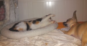 die kleine liebe Tiffy (jetzt Emily) ist jetzt schon etwas über eine Woche bei uns und wir haben viel Freude mit ihr. Wir haben ihr den Namen Emily gegeben und manchmal kommt sie sogar schon wenn man sie so ruft. Sie ist sehr schmusig und verspielt und hat sich so auf Anhieb mit unserem kleinen Hund Juanito und unseren beiden Russischblauen Katzen Nuschka und Mariechen verstanden. Jetzt sind sie alle ständig zusammen unterwegs und spielen und schlafen in der Gruppe. Besonders ist sie in unseren Vater vernarrt, bei ihm kuschelt sie wann immer es ihr möglich ist und schläft auch nachts bei ihm im Bett. Wir haben alle große Freude an der süßen Emily und sind sehr froh das sie unsere Familie bereichert.