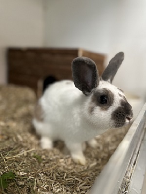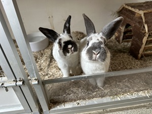 Cosmo und Wanda sind zwei junge aufgeweckte Kaninchen, die gemeinsam ein neues Zuhause suchen. Nach Cosmos Kastration haben wir die beiden Geschwistern bei uns wieder vergesellschaftet und sie verstehen sich sehr gut. Beide sind sehr neugierige Kaninchen, die wenig scheu vor dem Menschen besitzen. Aktuell leben sie bei uns in der Innenhaltung, weswegen sie aufgrund der aktuellen Außentemperaturen nur in Innenhaltung vermittelt werden. Im Frühjahr könnten sie bei wärmeren Temperaturen auch in die Außenhaltung.