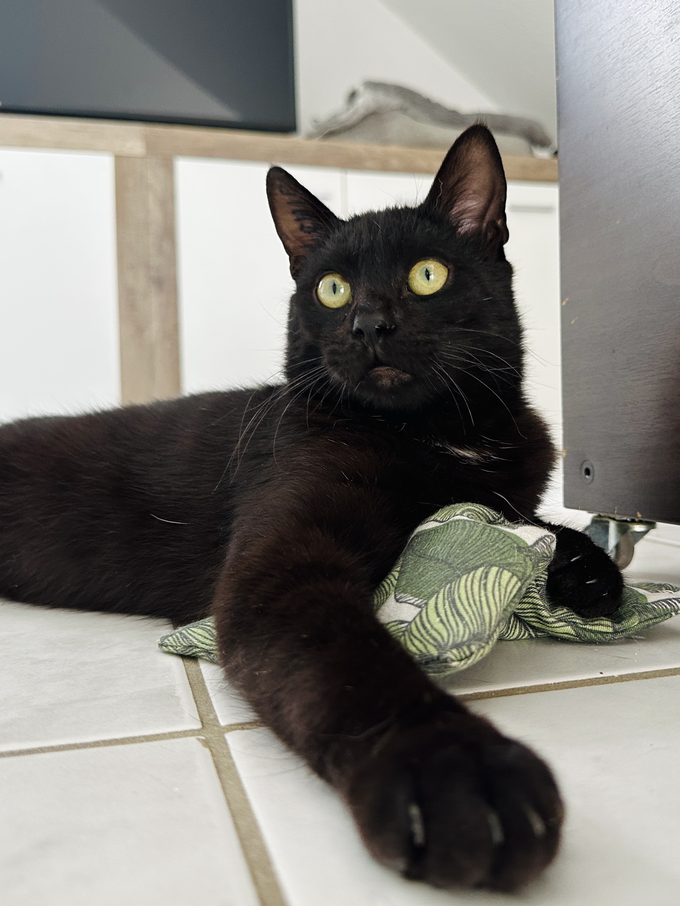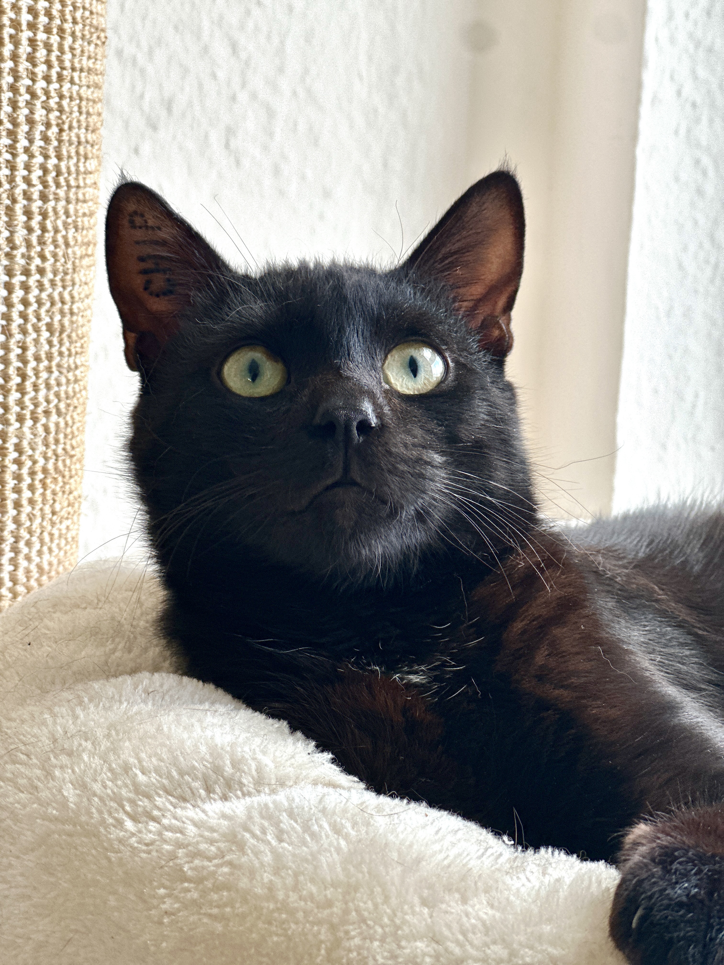 „Nero“ ist ein sensibler Jungkater, der auf seiner Pflegestelle erst einmal lernen musste, wie man mit anderen Katzen zusammen lebt. Er kommt ursprünglich von draußen und wurde extrem abgemagert aufgefunden, weswegen er dann auch zu Anfang richtig gepäppelt werden musste. Als „Nero“ auf seiner Pflegestelle ankam, wurden die vorhandenen Katzen angefaucht, angeknurrt und auf Abstand gehalten. Durch eine kontrollierte und langsame Vergesellschaftung lebt er nun mit drei weiteren Katern zusammen. Die Katzensprache muss „Nero“ aber noch lernen, denn er wird auch mal grober zu den anderen und wenn diese ihm zeigen, dass das zu viel war, dann versteht er das noch nicht und möchte dann weiter richtig grob „spielen“. Wir sind aber zuversichtlich, dass er das auch noch alles lernen und noch ruhiger im Spiel wird. „Nero“ wird auch auf seiner Pflegestelle noch mindestens 4x am Tag gefüttert, da er weiterhin noch zunehmen soll. Ein vorhandener Kater, der auch gerne rauft, hinterher rennen liebt und trotzdem ihm deutlich machen kann, wenn er zu grob wird, wäre ideal für „Nero“. Auf der Pflegestelle merkt man ihm bei manchen Geräuschen oder zu schnellen Bewegungen, dass er immer noch unsicher ist mit manchen Situationen und dann schnell das Weite sucht. Auf der Straße hat er also keine guten Erfahrungen gemacht. Ansonsten ist „Nero“ sehr verschmust, anhänglich und auch sehr kommunikativ. Wir suchen für ihn ein Zuhause mit einem schon vorhandenen Kater in reiner Wohnungshaltung mit gesichertem Balkon.