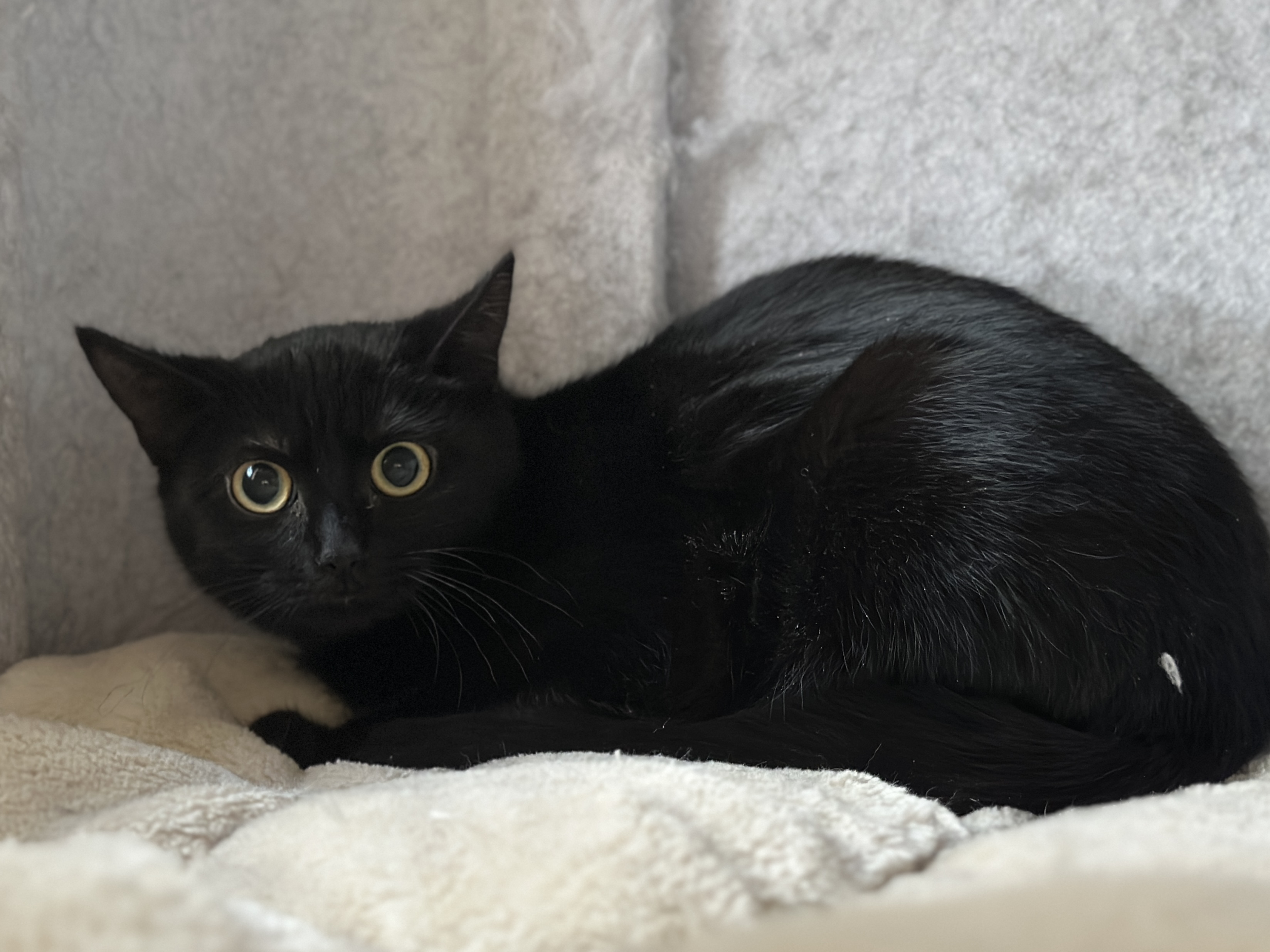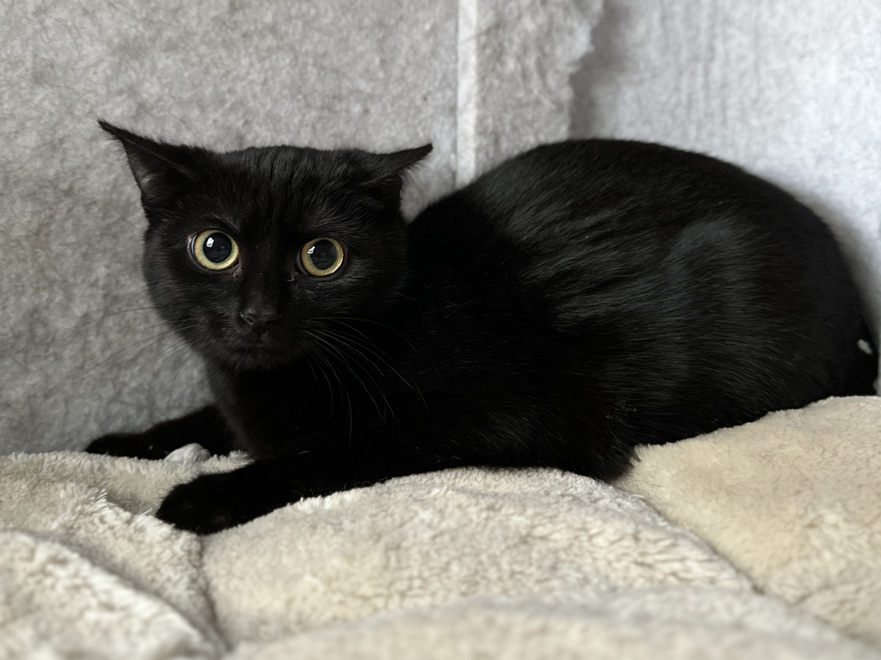 "Soraya" ist eine sehr zurückhaltende Katze, die sich meist in ihrer Höhle liegt und erst raus kommt, wenn keine Menschen mehr in der Nähe sind. Hier im Tierheim ist sie aber auch sehr gestresst, denn es ist hier immer was los und so ganz zur Ruhe kommt sie dadurch auch nicht. "Soraya" würde so gerne aus sich heraus kommen, was man ihr auch richtig anmerkt. Sie faucht nicht und sie haut auch nicht. Wir suchen für sie geduldige Menschen, die ihr Zeit, Ruhe und Geduld geben, damit sie auch endlich ankommen darf. Anderen Katzen gegenüber ist sie sehr sozial und sie sucht auch die Nähe zu anderen Katzen, weswegen sie auch nur zu einer schon vorhandenen sozialen Katze vermittelt wird, die ihr im besten Fall auch Sicherheit geben kann. Wir suchen für sie ein neues Zuhause in reiner Wohnungshaltung mit gesichertem Balkon oder ein Zuhause in ruhiger Wohngegend, wo sie nach einer längeren Eingewöhnung ihre Umgebung als Freigängerin erkunden kann.